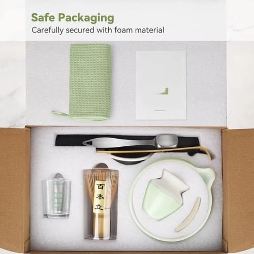 1. Our matcha set including Bamboo whisk, Whisk holder, Bowl, Scoop, Scoop holder, Measure spoon, Sifter, Tea cloth, Tea cloth